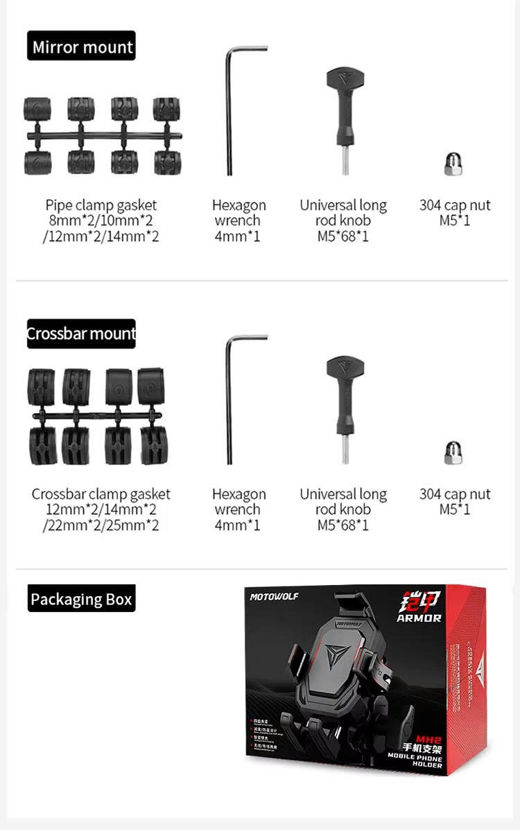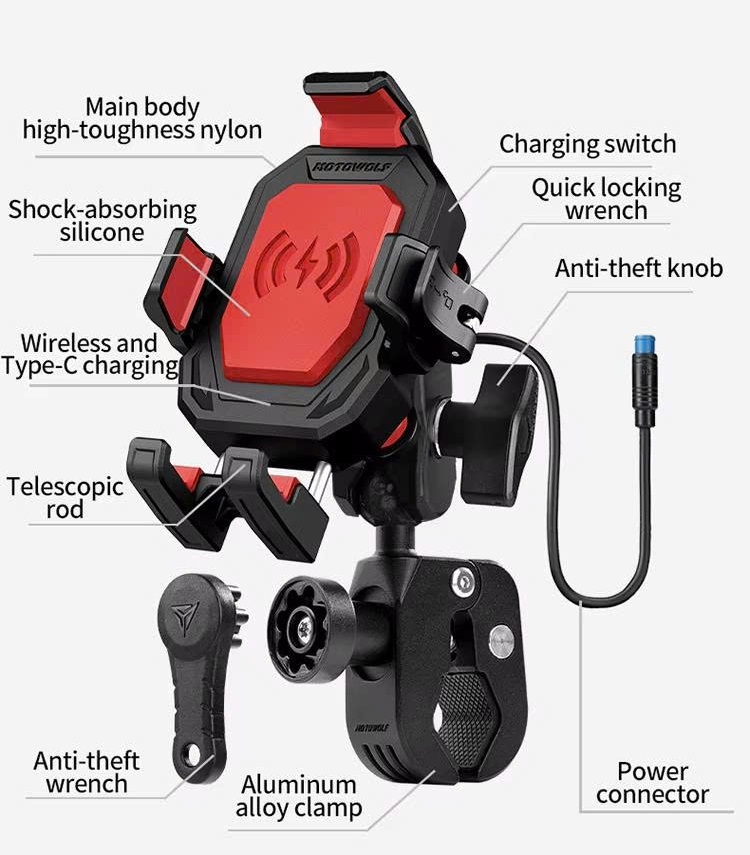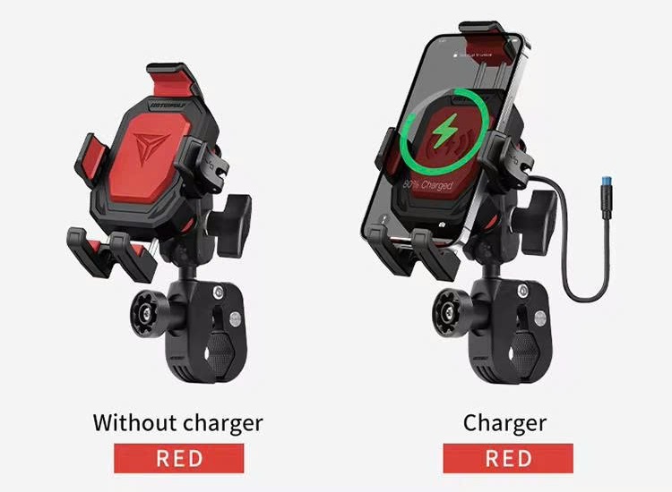 Giá Đỡ Điện Thoại Motowolf MH2 được ra mắt với 3 màu sắc khác nhau đỏ, đen, xanh. Cùng các chế độ ghi đông, chân kính, có sạc không dây/sạc type C, và không sạc.