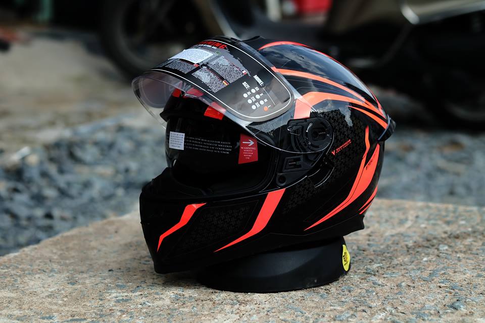 Nón Bảo Hiểm Fullface Yohe 967 2 Kính Đen Viền Đỏ được thiết kế 2 kính tiện dụng có thể sử dụng kể cả ngày và đêm, có nút gạt lên xuống tiện lợi kính ngoài chống khói bụi, gió và chói tốt.